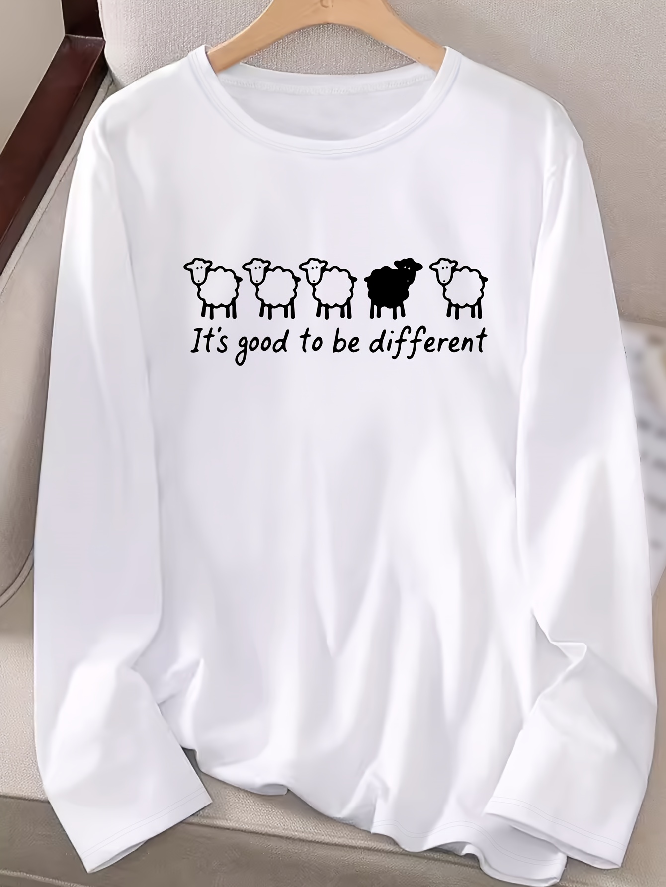 Women's Casual Long Sleeve Crew Neck T-Shirt - Soft Machine-Washable Fabric, Cozy Fall & Winter Top with "It's Good to Be Different" Graphic Print, Regular Fit for Casual Attire, Autumn Apparel, Playful Animal Design, Comfortable Clothing