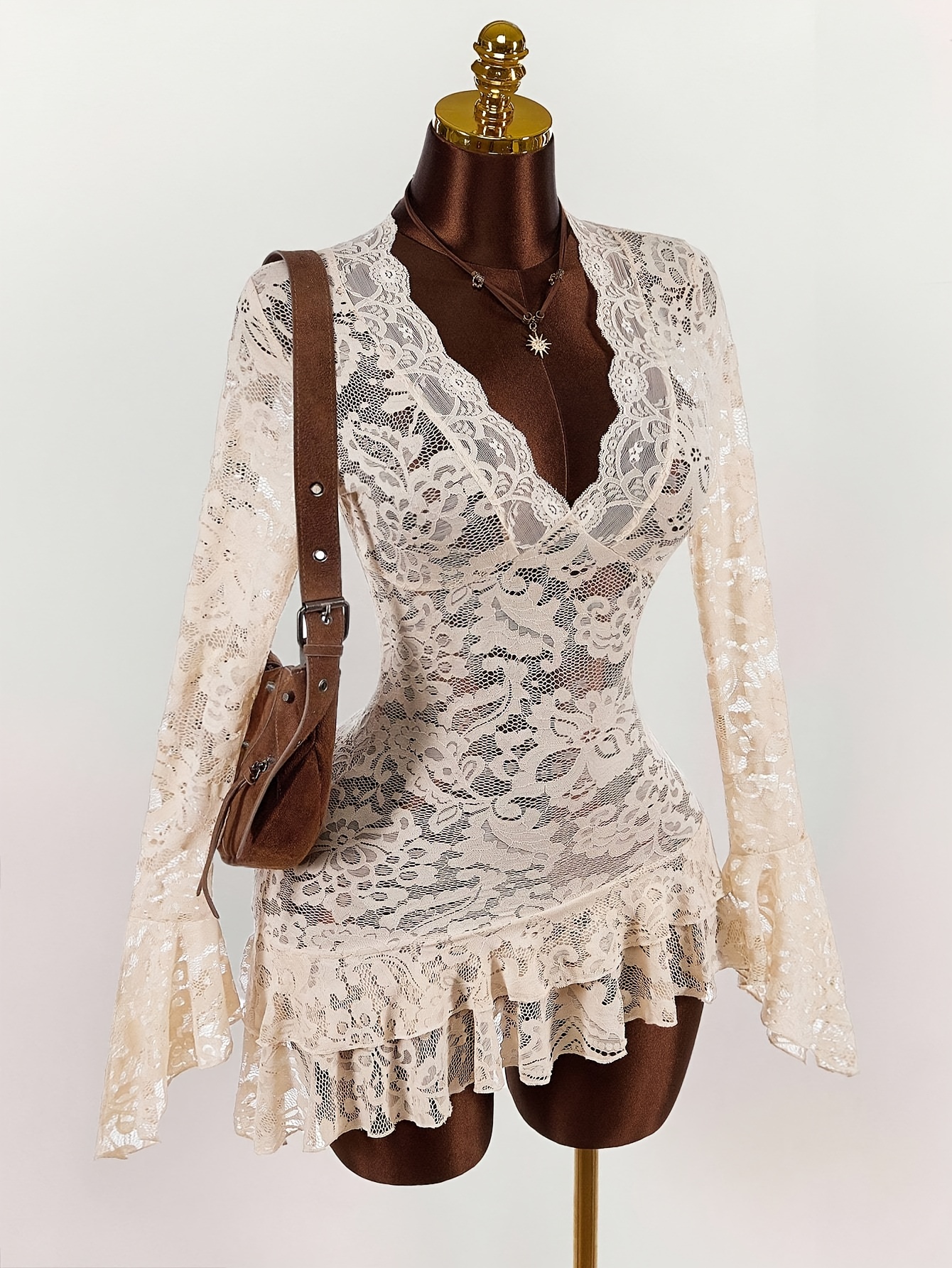 Women'S Y2K Retro Lace Top - Deep V-Neck Blouse with Flared Bell Sleeves, ElegantSexy Party & Formal Outfits, Non-See-Through Lace Shirt for Nightlife, Dates, Office - Spring/Fall Women'S Clothing, Date Night Attire, Ruffled Hem Design