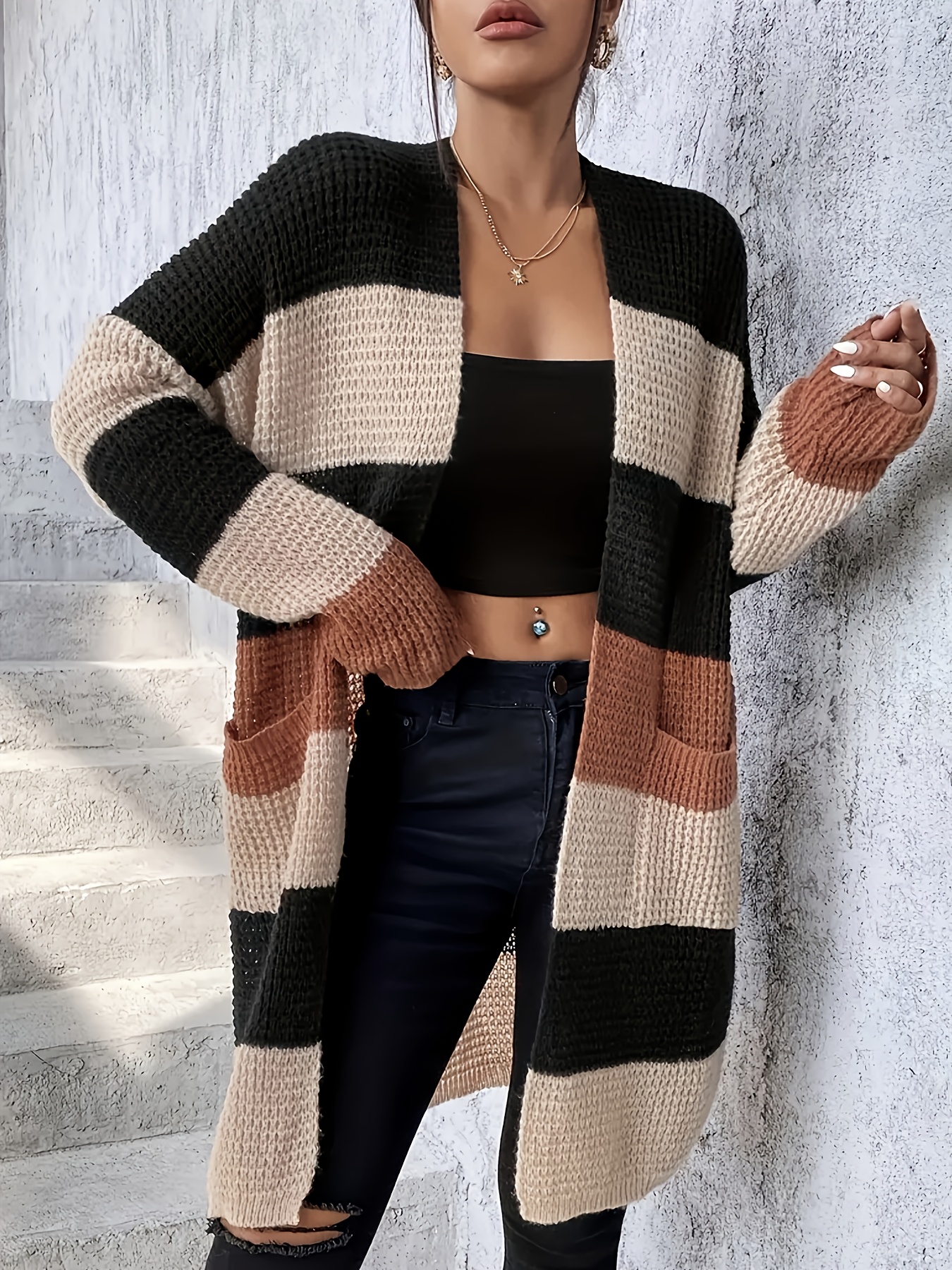 [Elegant Cardigan] Soft Elegant Women's Color Block Cardigan | Long Sleeve Mid-Length Sweater with Pockets, Relaxed Fit for Fall Winter, Casual & Formal Outfits