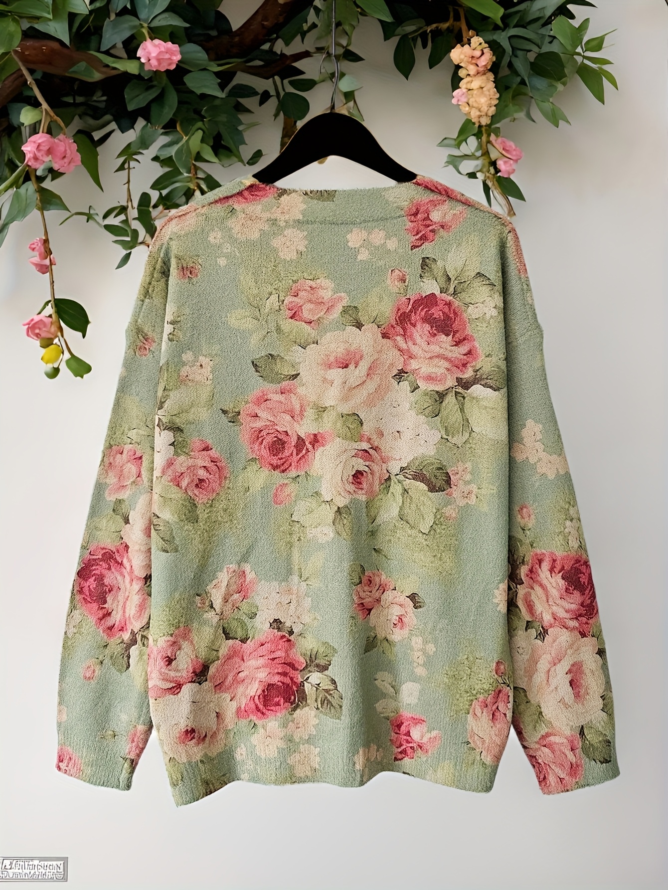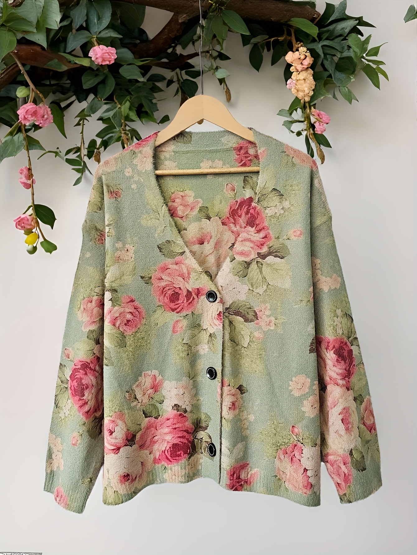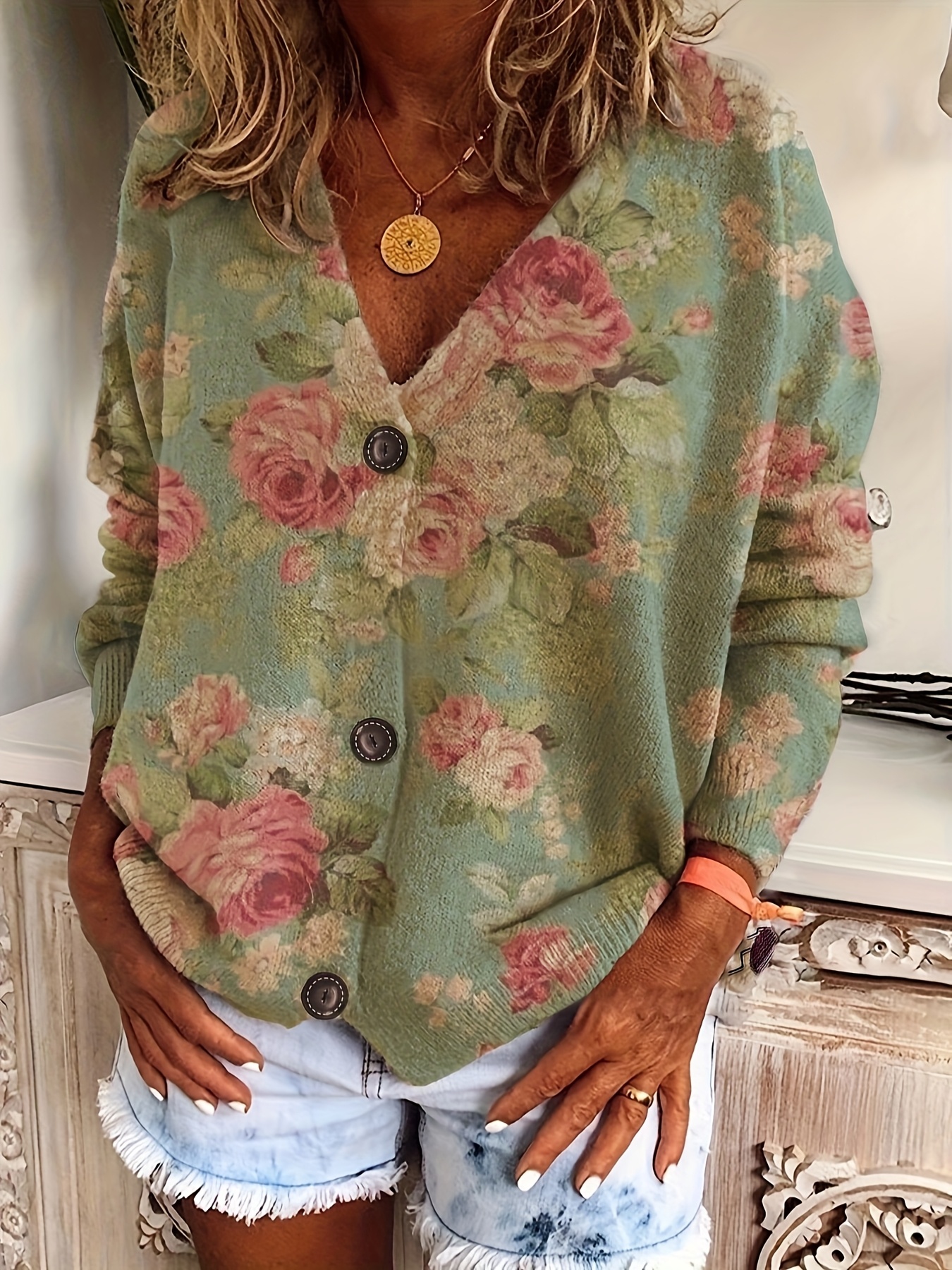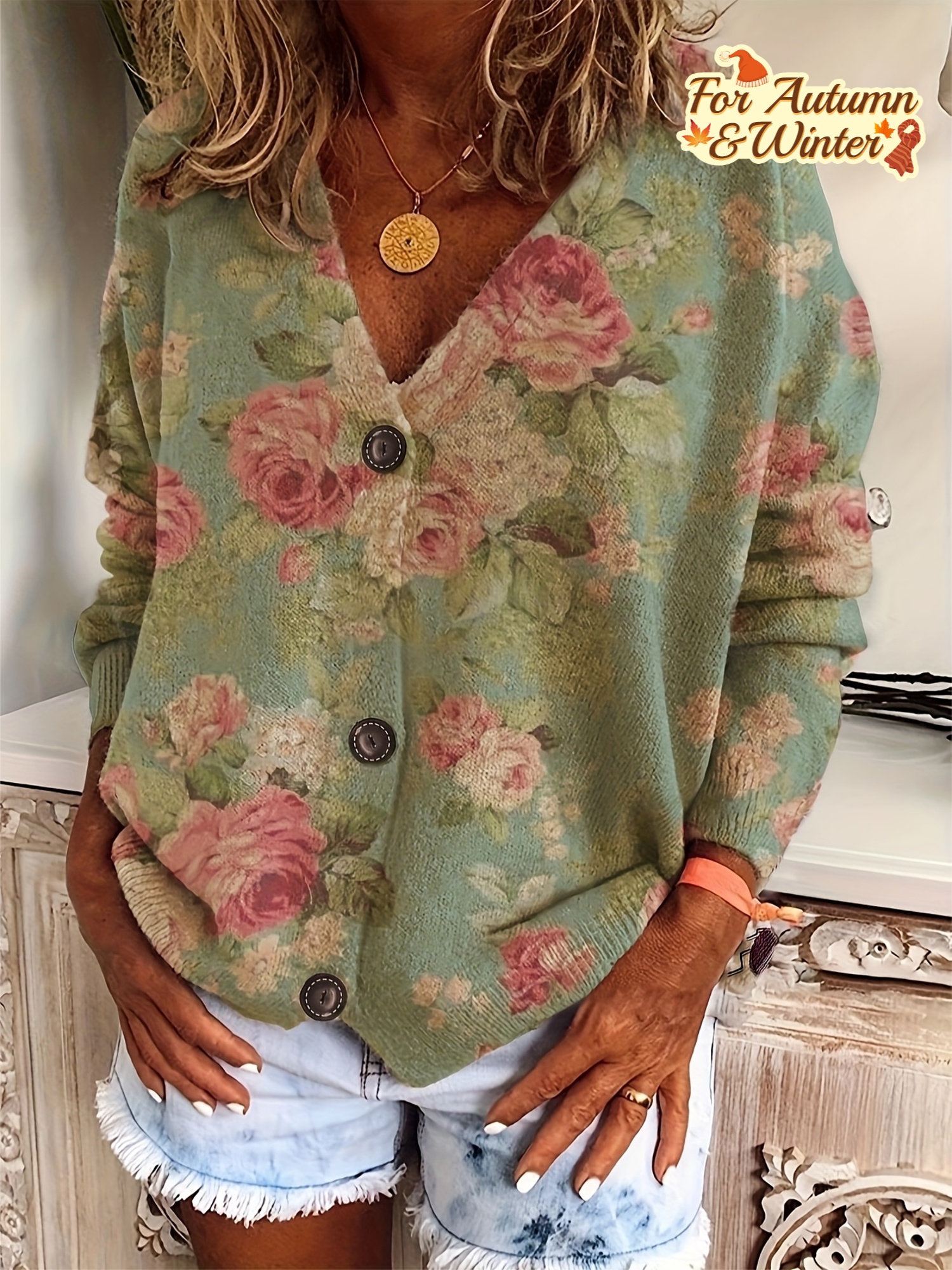 Plus Size, Autumn-Winter V-Neck Loose Fit Off-Shoulder Color Block Gradient Floral Print Button-Up Long Sleeve Women's Cardigan, Casual Elegant Commuter Sweater, Versatile Layering Outerwear