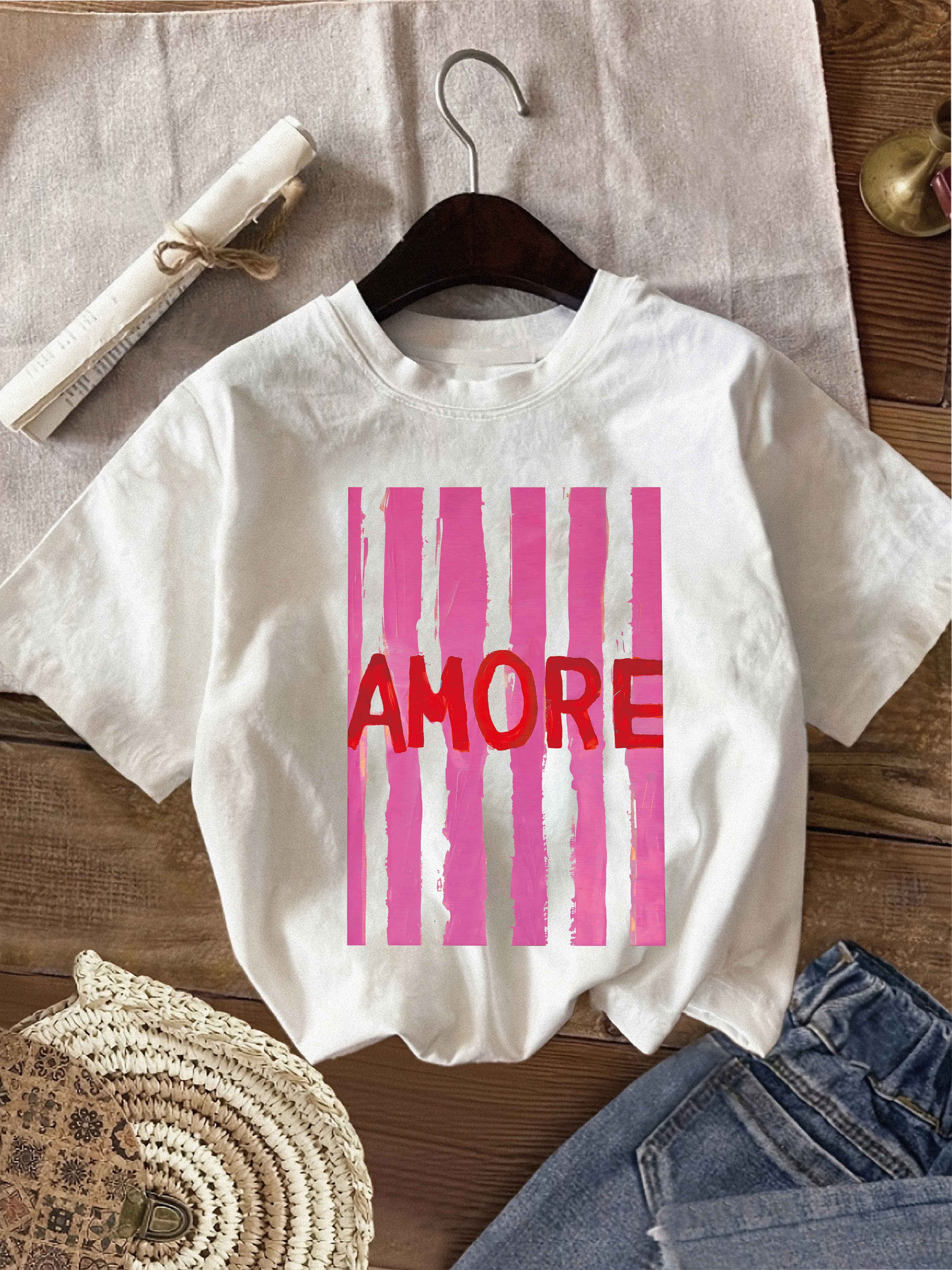 Women'S Casual AMORE Graphic Print T-Shirt - Short Sleeve, Round Neck, Lightweight Polyester, Pink Stripes Design, Perfect for Spring, Summer & Fall, Ladies T Shirts