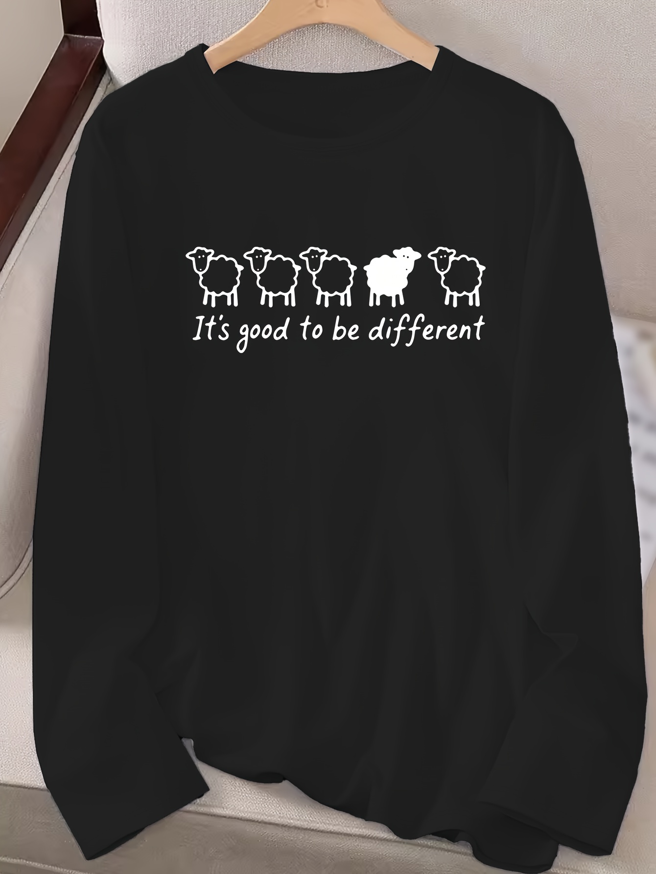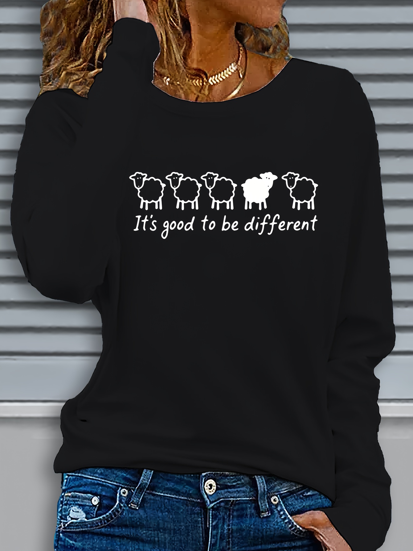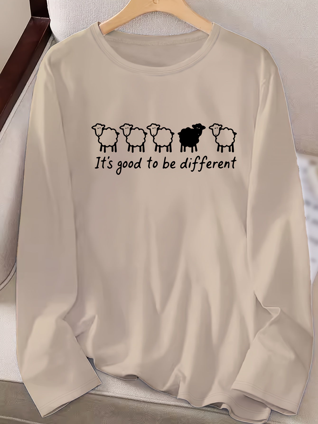 Women's Casual Long Sleeve Crew Neck T-Shirt - Soft Machine-Washable Fabric, Cozy Fall & Winter Top with "It's Good to Be Different" Graphic Print, Regular Fit for Casual Attire, Autumn Apparel, Playful Animal Design, Comfortable Clothing