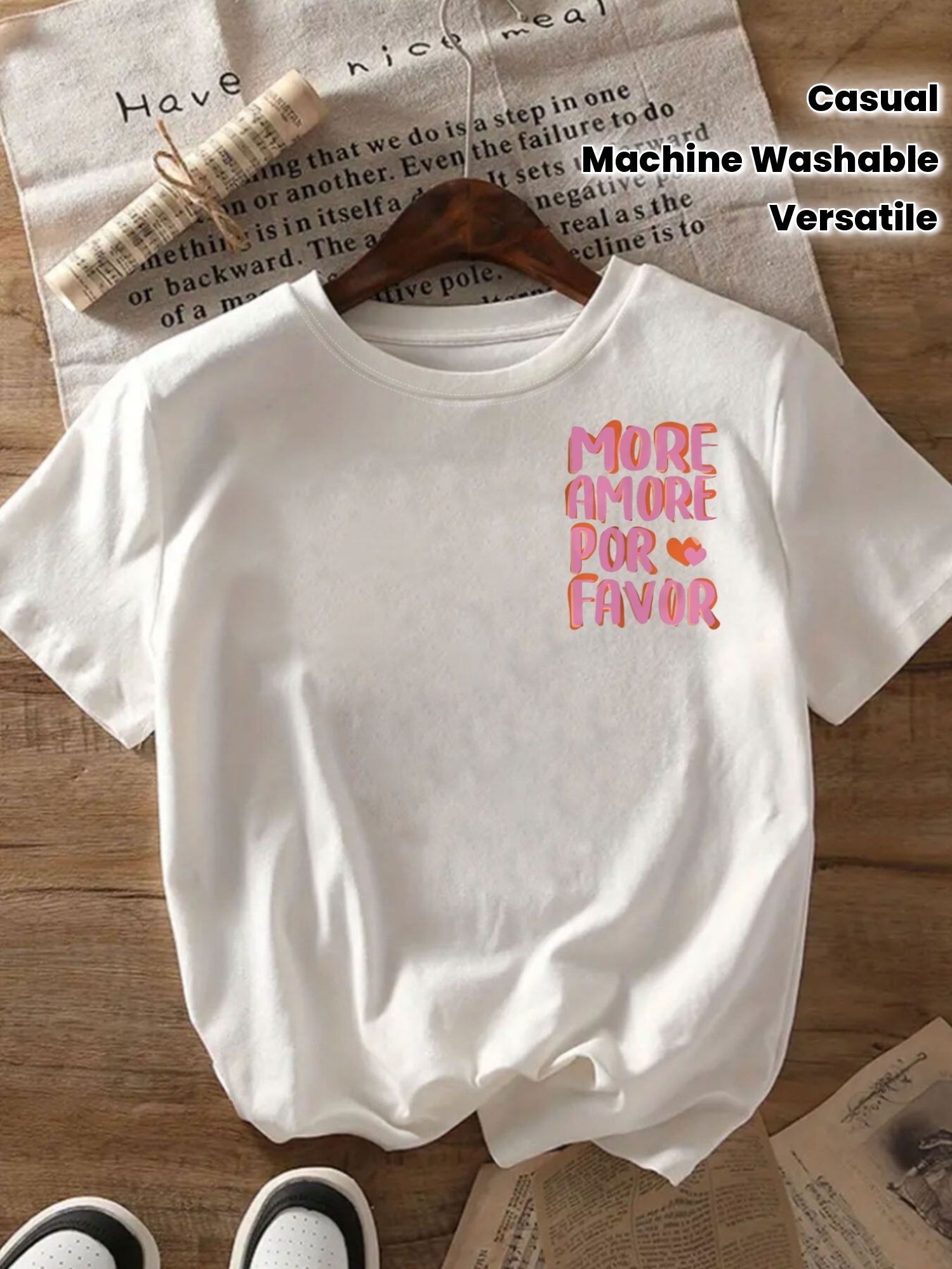 Women's Casual Short Sleeve T-Shirt with Bold "MORE AMORE POR FAVOR" Slogan Print - Black with Pink & Orange Lettering, Round Neck, Comfort Fit, Machine Washable, All-Season Versatile Top, Everyday Apparel, Playful Graphic Tee, Comfortable Fit Shirt