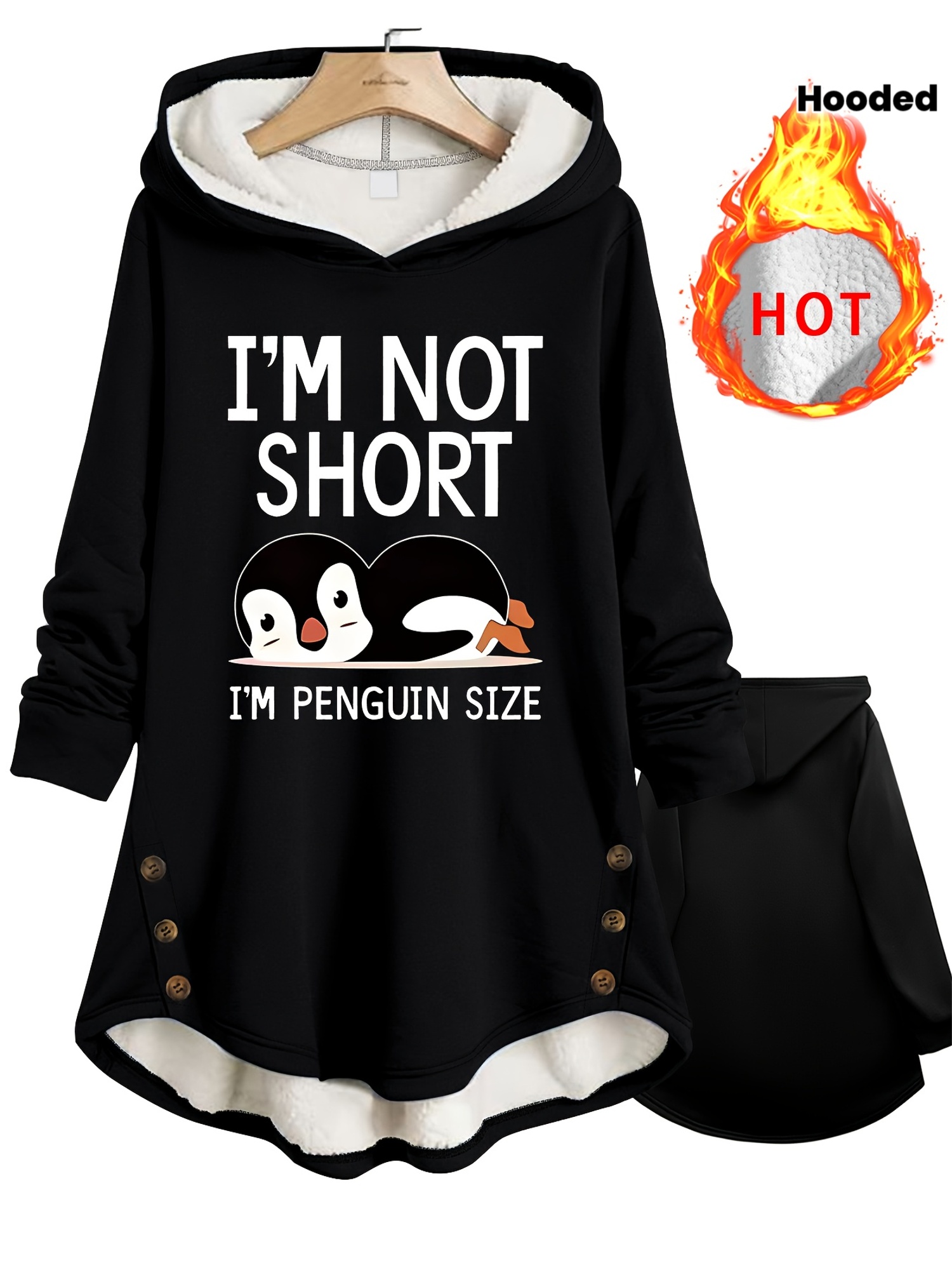 Women's Funny Penguin Graphic Hooded Jacket - Winter Coat with "I'm Not Short I'm Penguin Size" Saying, Black Hoodie Sweater, Machine Washable Cold Weather Outerwear for Everyday & Themed Events